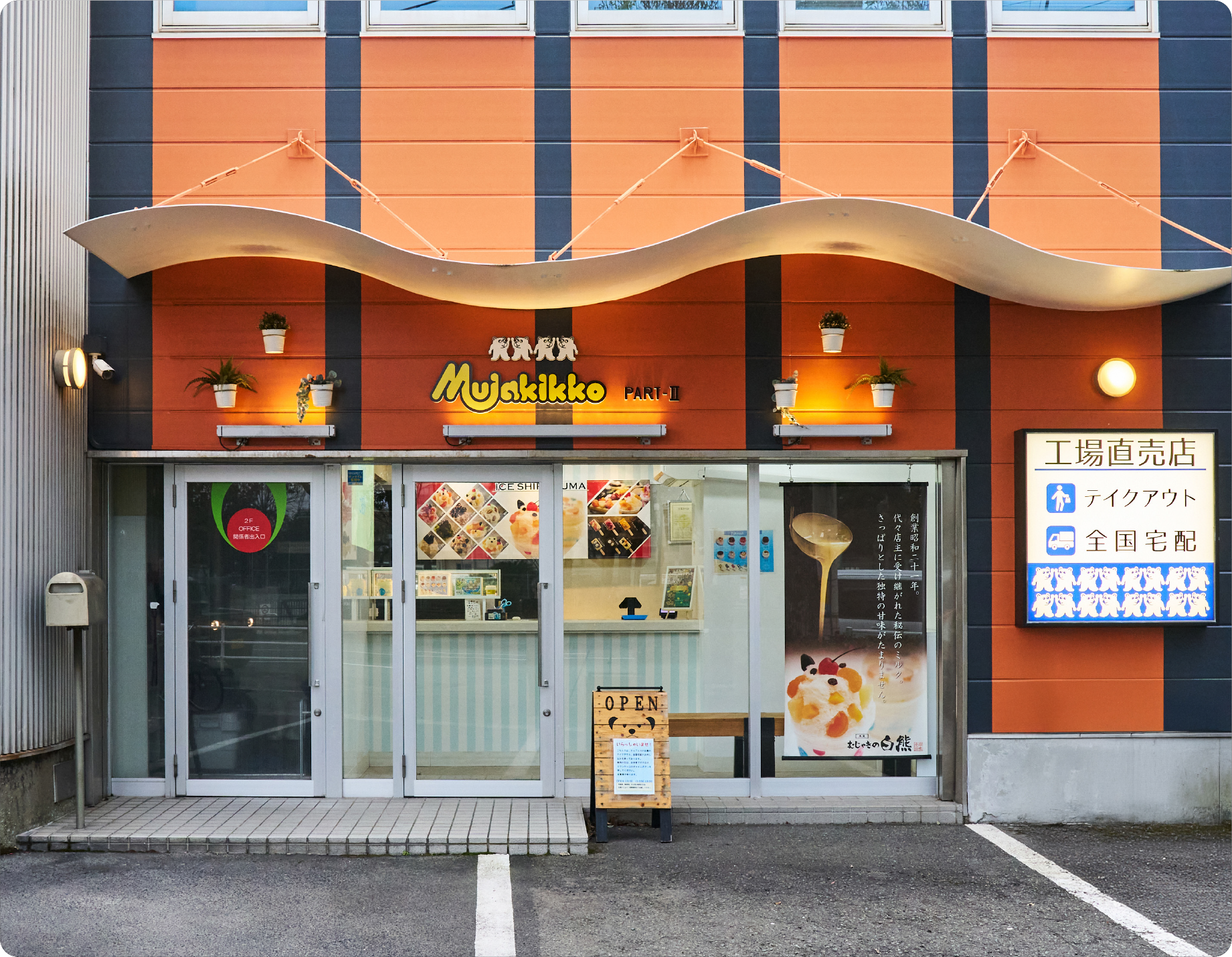 工場に併設された当店は、天文館まで行かなくても本家白熊を手軽に購入できるテイクアウト専門店(※カップ商品、バータイプ商品に限ります。)駐車場もあり、お車でも立ち寄りやすく、ご自宅用はもちろん、帰省されたご家族への特別なおもてなしにもぴったり。